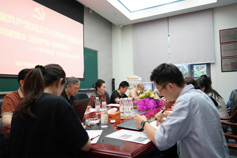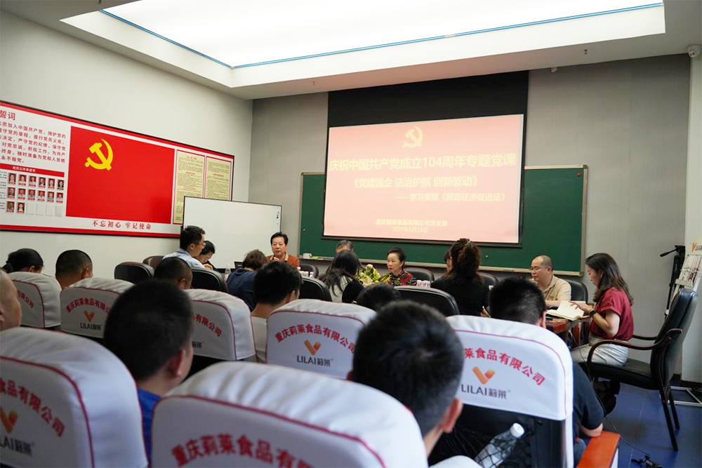 為熱烈慶祝中國共產黨成立104周年,深刻領會黨的創新理論,賦能企業高質量發展,2025年6月24日,重慶莉萊食品有限公司黨支部舉辦專題黨課活動,進行《民營經濟促進法》學習交流。全體黨員、入黨積極分子及公司中高層領導參加學習。